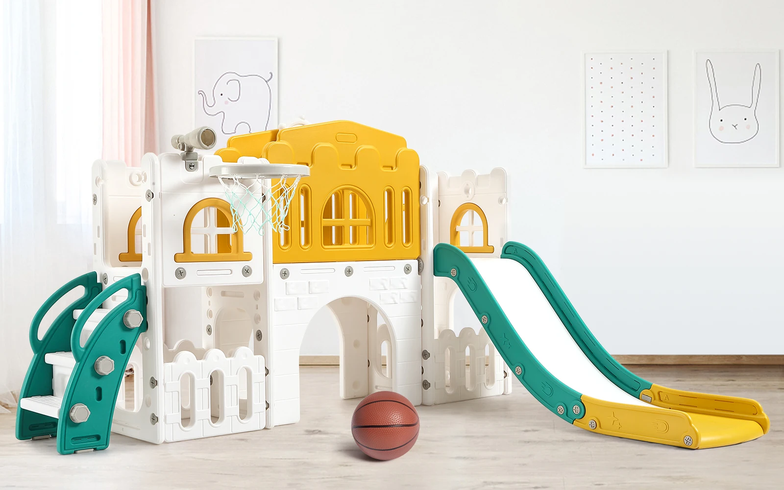 🎈 8 IN 1 TODDLER INDOOR PLAYGROUND – Our toddler slide playset comes with multiple fun activities, including a freestanding slide, climbing ladder, basketball hoop, crawling tunnel, telescope, and steering wheel, which supports 2-3 kids playing together.